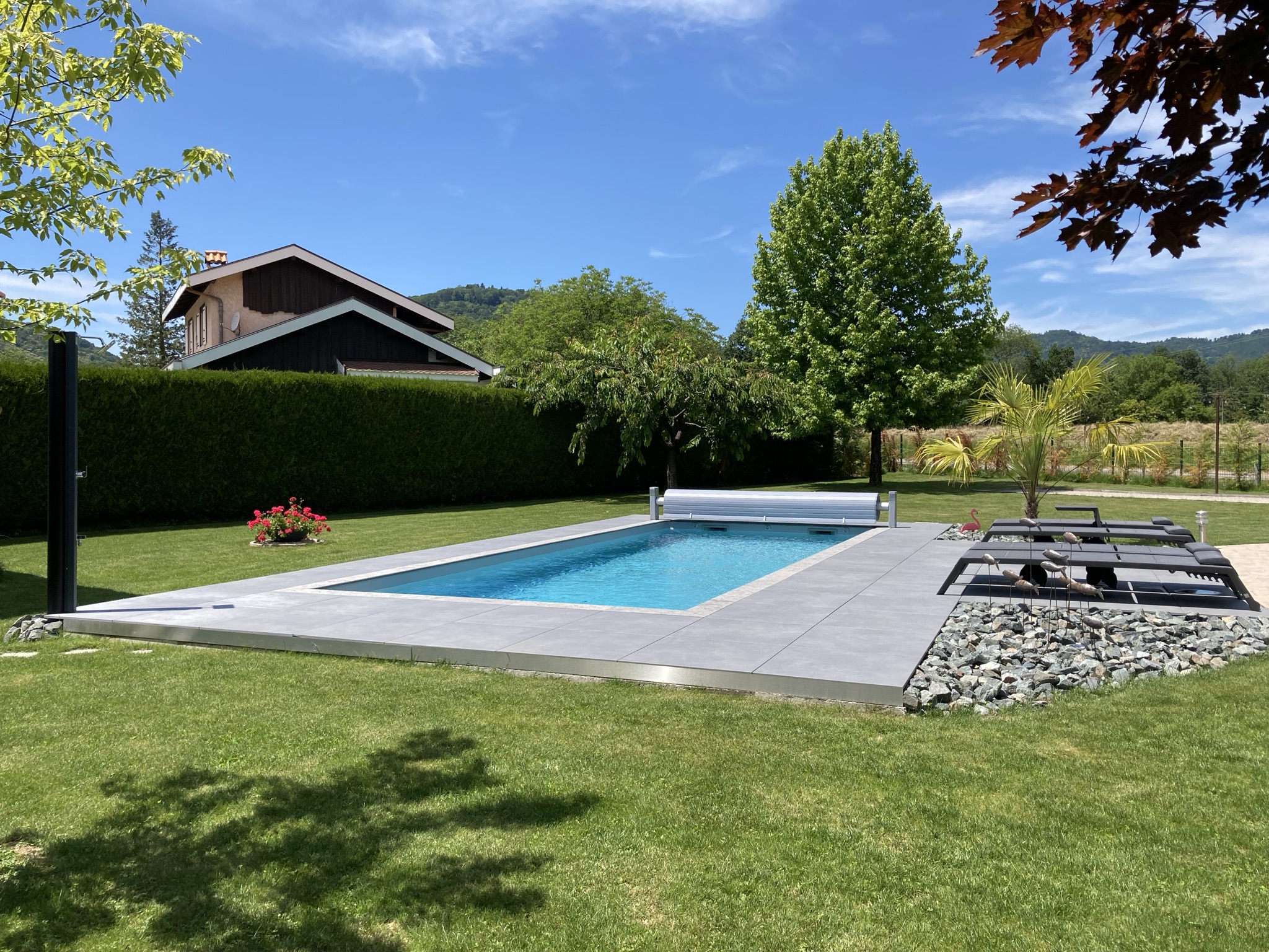 Des piscines premium allant de 3,90 m à 10,80 m de long, en fond plat ou pente composée avec un coffre immergé pour volet automatique.